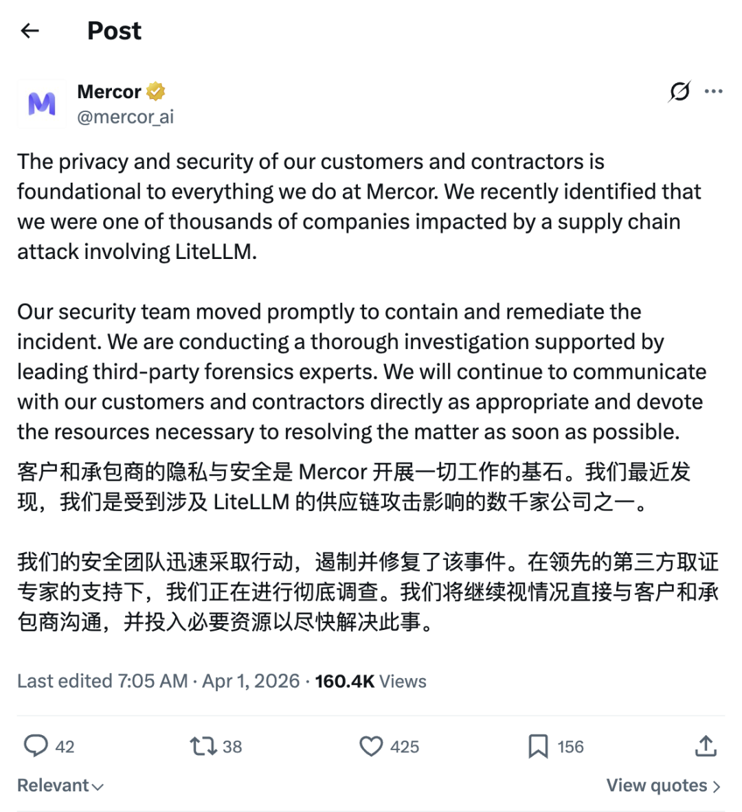 4 月 1 日,Mercor 在社交媒体发布声明,确认自己是 LiteLLM 供应链攻击事件中“数千家受影响企业之一”,表示安全团队已迅速介入遏制和修复,并聘请了第三方取证专家展开调查。