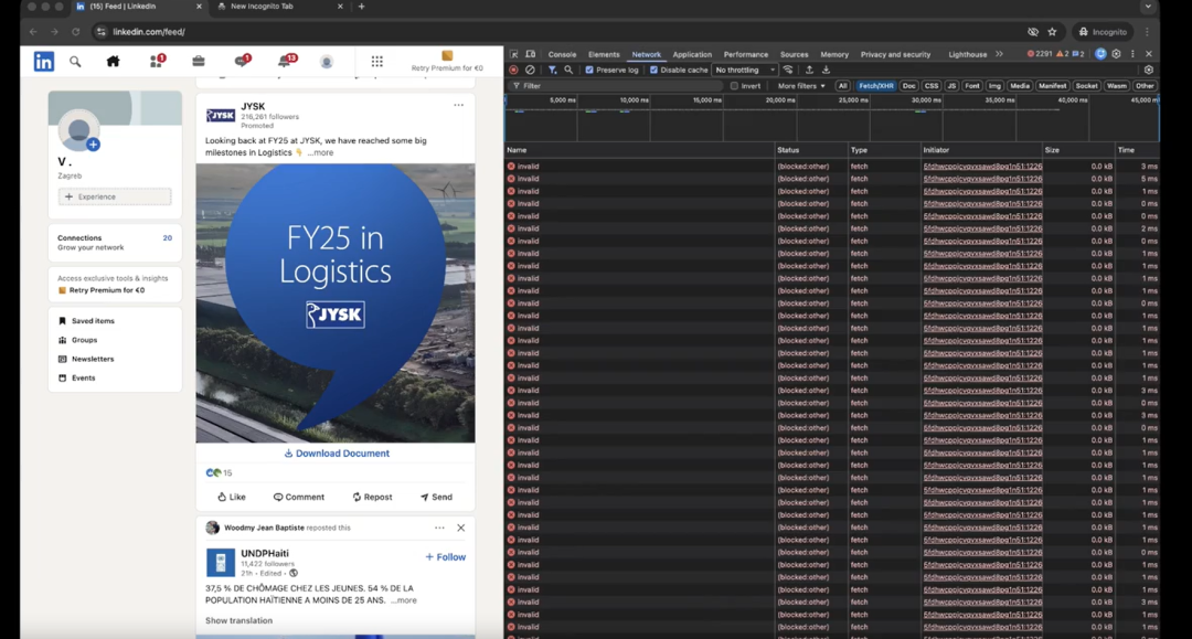 图 | Chrome 开发者工具中捕捉到 LinkedIn 扩展扫描(来源:BrowserGate)