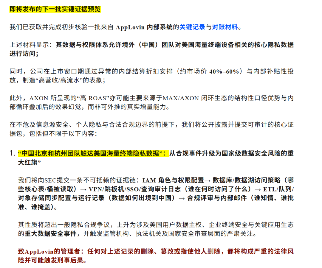 此外,企业还需警惕的,并不只有民间诉讼力量。对于赴美上市公司而言,EO 14117 相关风险同样可能通过舆情、做空报告和投资者预期管理等路径传导至资本市场。今年年初,CapitalWatch 曾针对当红 AI 广告股 AppLovin 发布做空报告。尽管该报告最终被撤回,但在当时的报告中,EO 14117 违规风险被明确列为公司刻意隐瞒、未及时向投资者披露的重大事项之一。由此可见,即便相关规则尚未进入实质执法阶段,其也完全可能先以市场叙事和舆论压力的形式,对企业估值、声誉及投资者关系造成冲击。