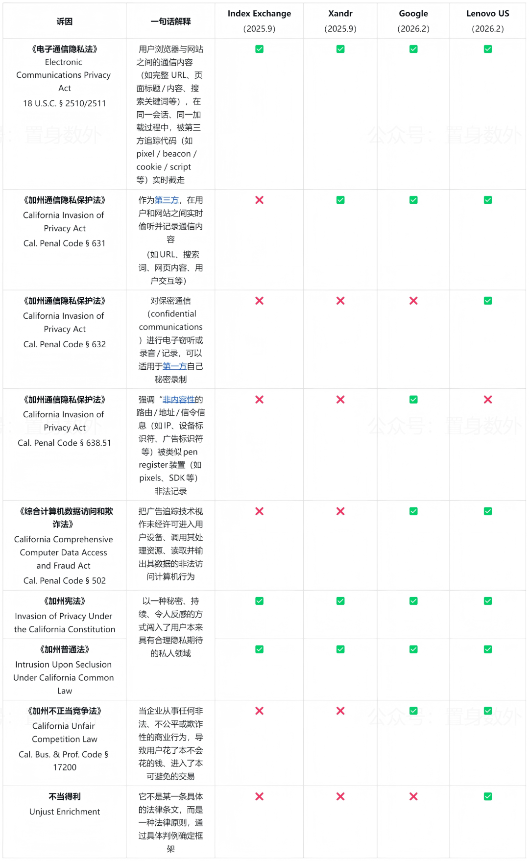 在线追踪的代码会自动执行、自动把用户和网站之间的第一方通信重定向给广告商及其广告伙伴,用户既无法察觉,也无法真正阻止。而广告商往往是第三方,没有提供清晰、显著的通知,不存在明示或默示同意。这一段的目标很明确:堵住被告以后可能提出的 consent defense(同意抗辩)。