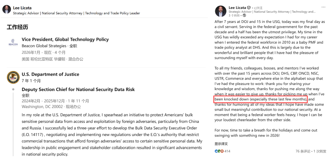 另外一位在FIRS专注于National Security Data Risks的Deputy Chief---Lee Licata于2026年1月离职,并透露过去一年经历了“创伤”。