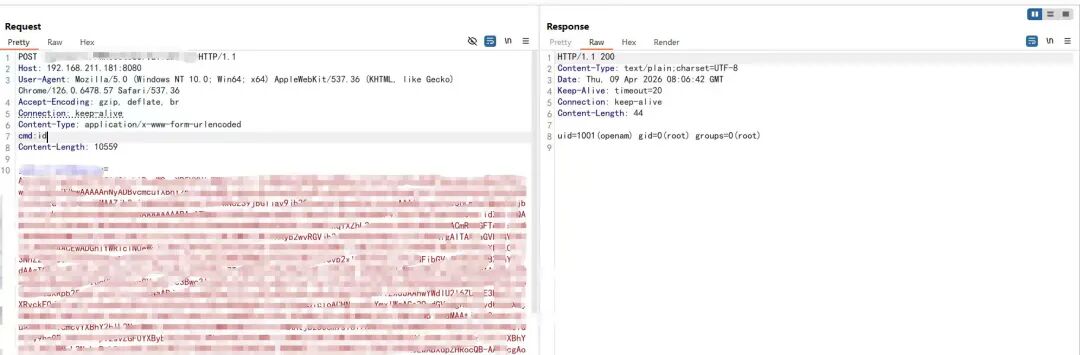 目前,奇安信威胁情报中心安全研究员已成功复现OpenAM 远程代码执行漏洞(CVE-2026-33439),截图如下: