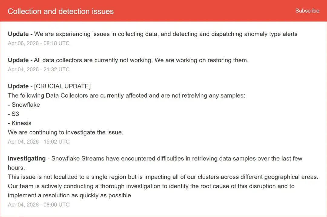 自上周六早晨起,Anodot状态页面显示,其所有连接器在各个地理区域均出现中断,其中包括Snowflake、S3和Amazon Kinesis。