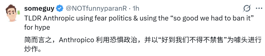 这件事引发了广泛讨论,有些人对 Anthropic 那种「我们的模型太强因此不能放出来」的论调大加讽刺。