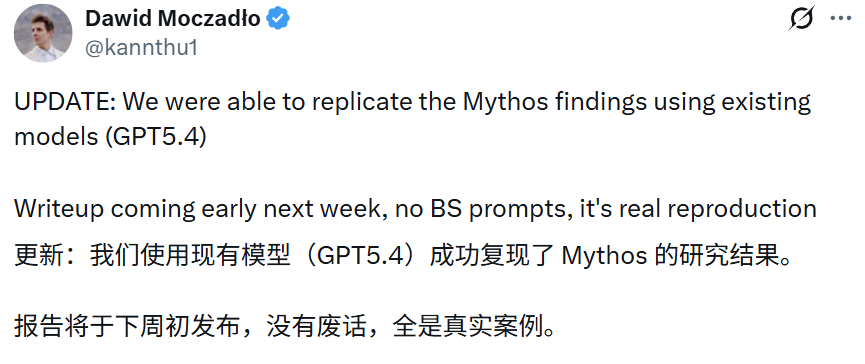 他还表示他们已经使用 GPT-5.4 成功复现了 Mythos 的研究结果。