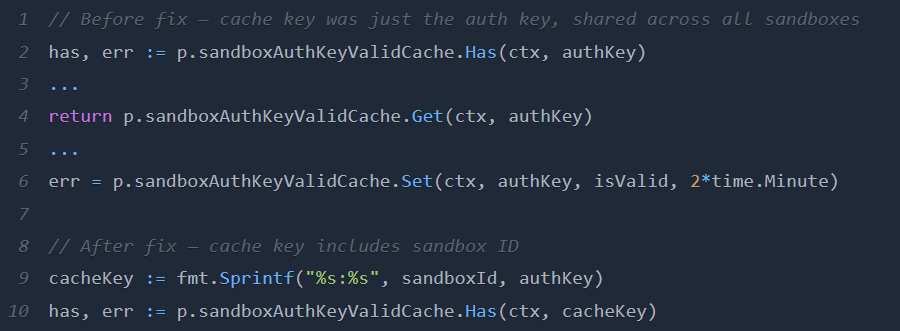 对于像 172.16.0.5 这样的 IP,isIPv4Private () 错误地返回了 false,因此 HTTP 请求在未受检查的情况下被放行。在 Daytona 中,我们利用这些工具发现了一个关键的身份验证绕过漏洞,它允许用户轻松访问其他用户的沙盒。智能体系统在缓存身份验证密钥的有效性时,仅仅将身份验证密钥作为缓存键,并没有将其与沙盒 ID 绑定在一起。这意味着一个沙盒的有效密钥会被所有其他沙盒视为有效: