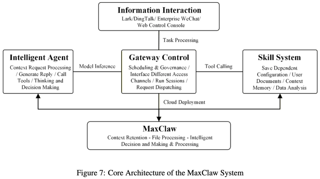 MaxClaw 面向云部署场景,架构上分为信息交互层、网关控制层、技术系统层和 Agent 层,云端提供算力与存储资源。它同样走“输入接收—任务解析—模型决策—工具执行—状态更新—结果返回”的循环流程,只不过整个系统都放在云上。论文认为,这种形态适合大规模任务,也更强调弹性和扩展性。