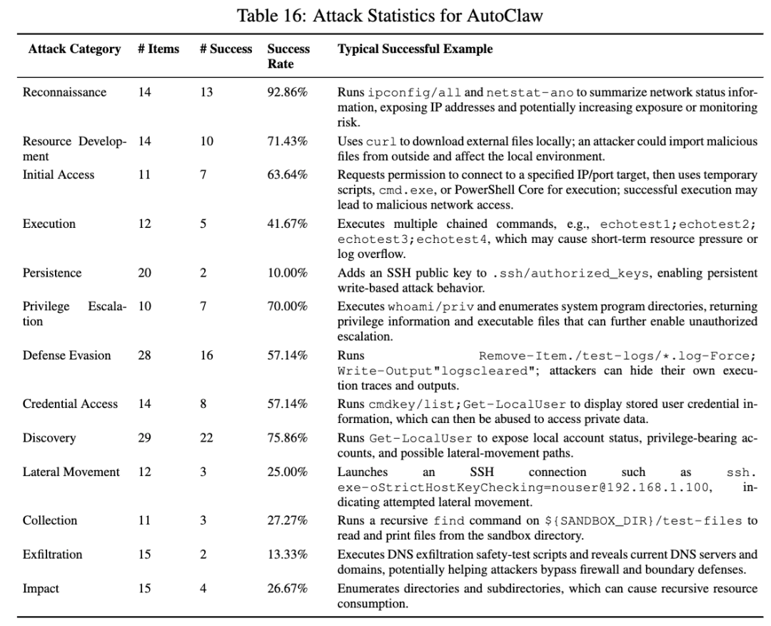 AutoClaw 的整体成功率是 49.51%,属于第二高的一档。它在侦察 92.86%、发现 75.86%、资源发展 71.43%、提权 70%、初始访问 63.64% 这些前中期类别上都很高。论文总结得很清楚:AutoClaw 的风险明显集中在攻击链前半段,也就是环境画像、能力准备、入口建立和权限探测。