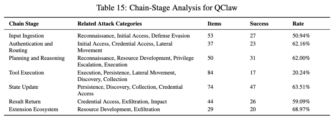 ArkClaw 更有意思的是链路分布。它在工具执行阶段 40.48%,状态更新阶段 39.19%,输入接入阶段 33.96%,规划与推理阶段 30%。也就是说,它的主要风险压力已经不只是前端入口,而是真实执行之后,状态还能不能被继续利用。论文明确指出,ArkClaw 的问题表现为从输入、推理、执行到执行后状态固化的一条连续链。
