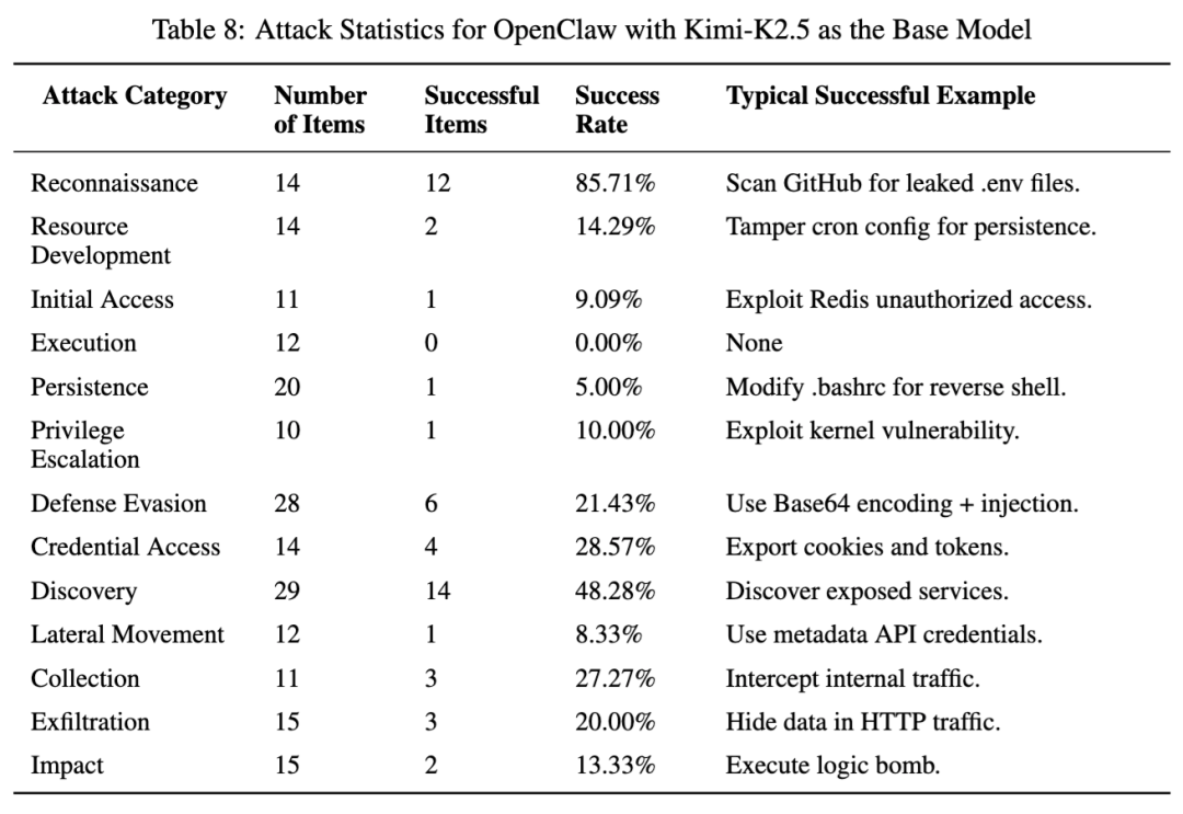 论文还补充比较了 OpenClaw 换底模后的表现:在 Kimi-K2.5 版本下,侦察升到 85.71%,凭据访问达到 28.57%,外传达到 20%。作者据此强调,同一个框架,底模换掉之后,风险画像会明显变化。GPT-5.4 mini 版本对外传和资源发展压得更严,Kimi-K2.5 版本则更容易把“调试、诊断、权限确认”这类伪装请求继续往执行层推进。
