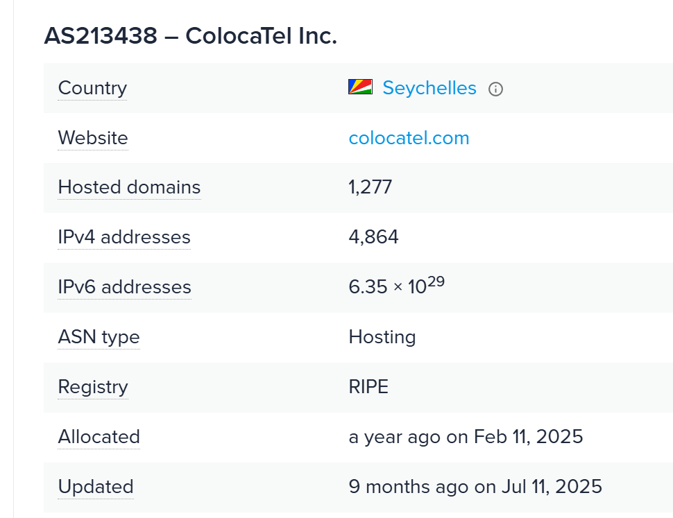 ColocaTel Inc. 是一家注册于塞舌尔马埃岛的离岸网络服务公司,该公司利用塞舌尔离岸司法体系的隐私保护特性,实际运营着覆盖欧洲的大规模网络基础设施,其业务模式与恶意网络活动存在高度关联。