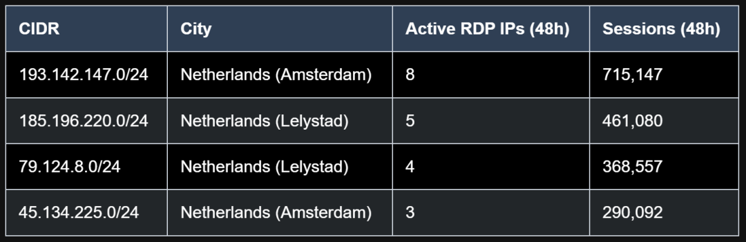 将以下四个 / 24 网段加入入站 RDP 流量的监控列表或直接拦截规则:193.142.147.0/24、185.196.220.0/24、79.124.8.0/24、45.134.225.0/24
