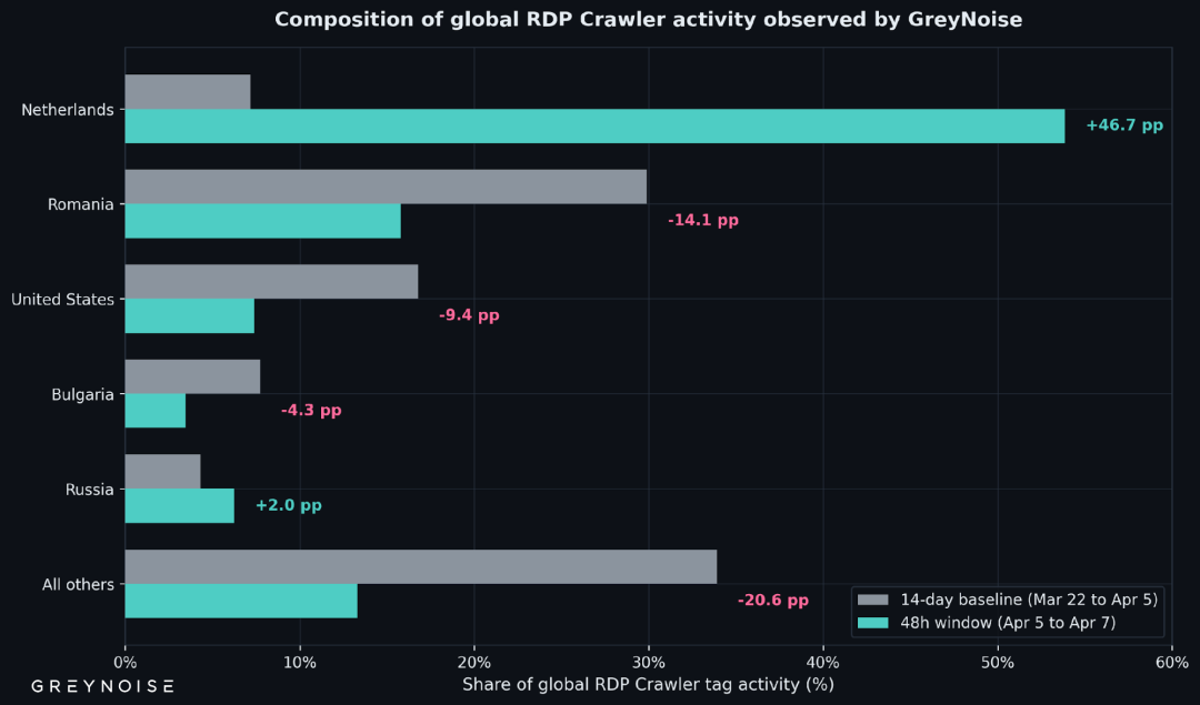 在 4 月 5 日至 7 日的 48 小时内,荷兰的全球 RDP 扫描占比从之前 14 天基线的 7.17%,飙升至 53.86%,一跃成为全球第一。而罗马尼亚的占比则从 29.89% 下降到 15.78%。