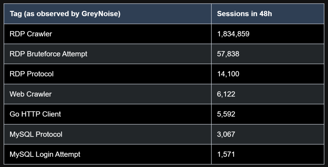 GreyNoise 发布最新监测数据显示,仅仅 21 个 IP 地址,就在短短 48 小时内产生了全球近一半的RDP远程桌面协议扫描流量。