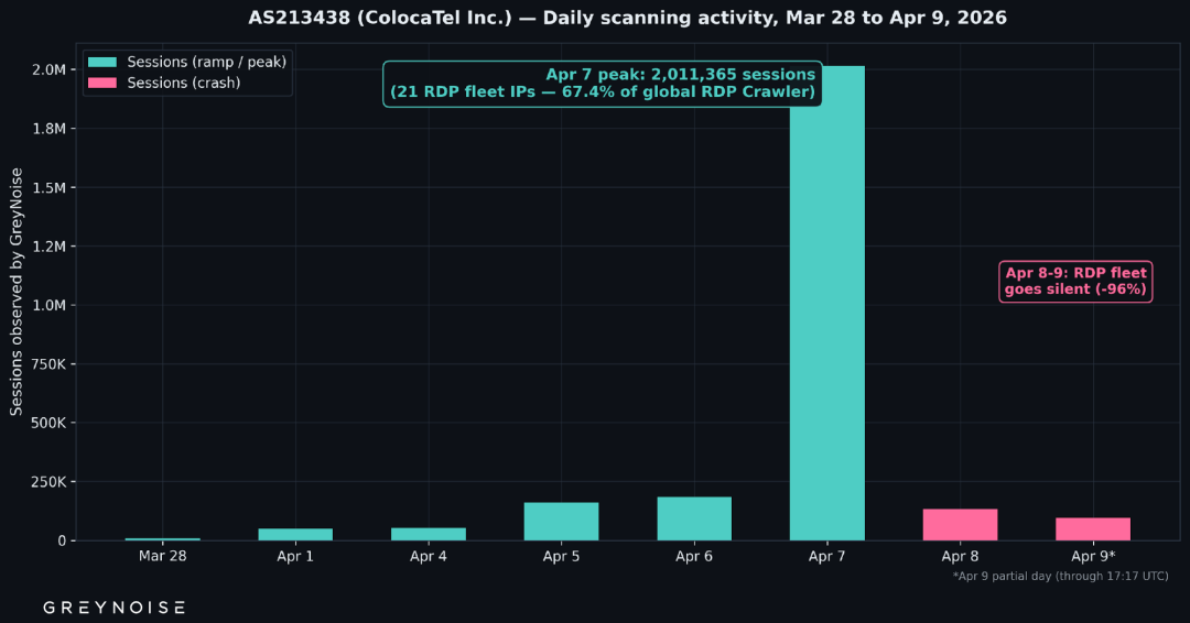 在 2026 年 4 月 5 日至 7 日的 48 小时窗口内,21 个特定 IP 地址产生了全球 49.7% 的 RDP 爬虫活动,而其余所有互联网扫描源加起来,才贡献了剩下的一半流量。