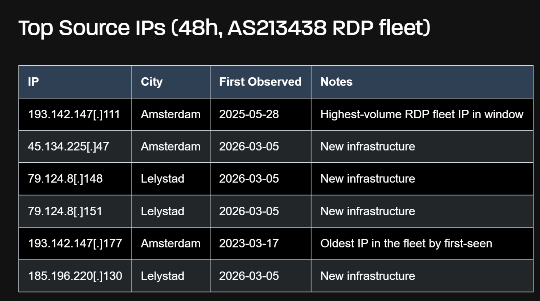 很多人会误以为这种大规模扫描是由被感染设备组成的分布式僵尸网络发起的,但实际上,这个 RDP 扫描集群是部署在专业托管服务商处的集中式基础设施。