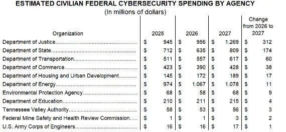 在2027年预算中,最大受益者是司法部,其网络安全预算将增加3.12亿美元,增幅达33%,总额达到12.7亿美元。这是所有民事机构中最大的一项增长。
