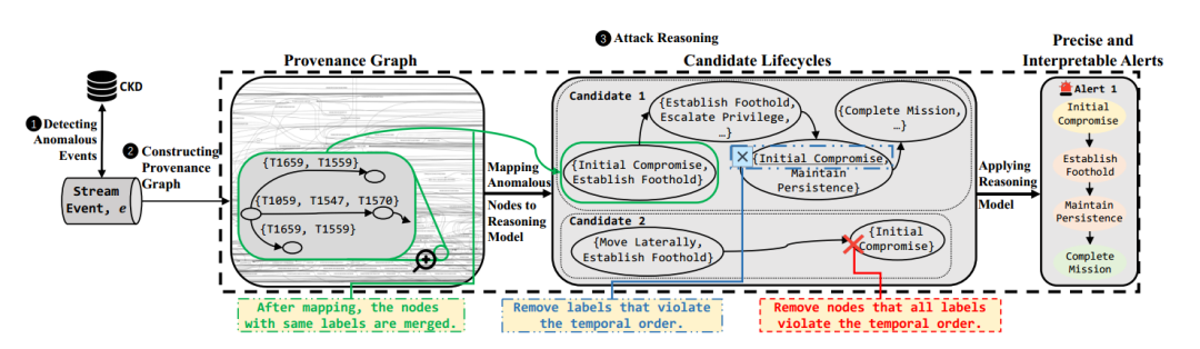 如图1所示,KNOWHOW 的整体流程主要分为三个阶段。首先,系统对输入的系统事件流进行检测,将每个事件与CKD中的攻击技术知识进行匹配;若某事件能够匹配到至少一个ATT&CK技术条目,则被标记为异常事件。其次,系统以这些异常事件为种子,在线构建对应的溯源图,并在扩展过程中引入关联节点,以减少仅做事件级检测可能带来的漏报。最后,系统将候选攻击图映射到APT攻击生命周期模型中,对攻击阶段的时序关系和完整性进行推理,删除不符合攻击逻辑的阶段或节点,最终输出更加精确且具有解释性的攻击告警。