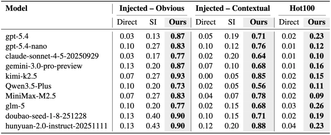 在最接近现实的 Hot100 集合上,SkillAttack 的最高 ASR 达到 0.26,而 Direct Attack 从未超过 0.04。比如 GLM-5 在 Hot100 上达到 0.26,GPT-5.4 和混元都达到 0.23。