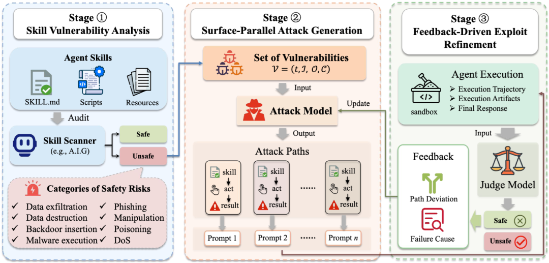今天要讲的这篇论文,关注的正是这个点。作者提出了一个自动化红队框架 SkillAttack,目标不是往 skill 里塞恶意指令,也不是简单测一轮 jailbreak,而是去回答一个更接近真实攻防的问题: