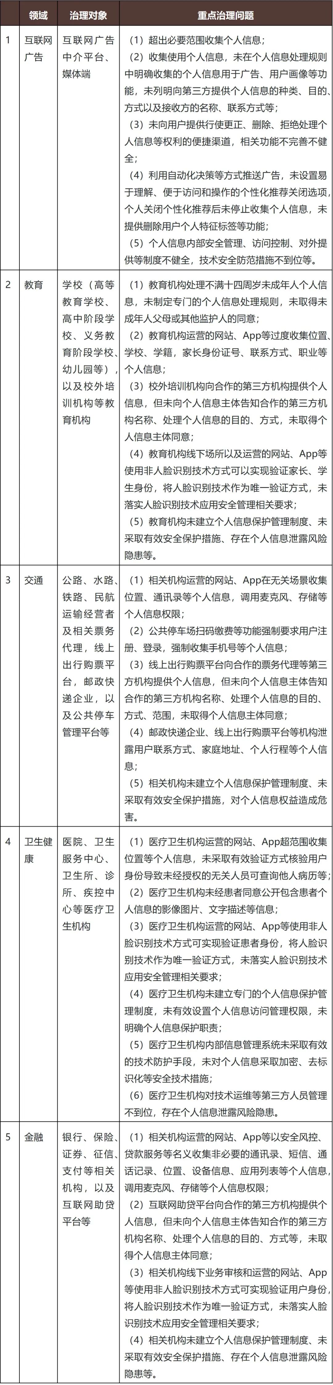 (4)技术合规。每一个子领域都重申了“有效安全保护措施”的重点治理问题,要求相关企业建立个人信息保护管理制度,防范个人信息泄露、个人信息权益被侵犯等风险。个人信息保护是法律问题,也是技术问题,个人信息保护合规必然要求技术合规,这在过去一年的专项行动中体现十分明显,也将是今年专项行动的重点趋势。