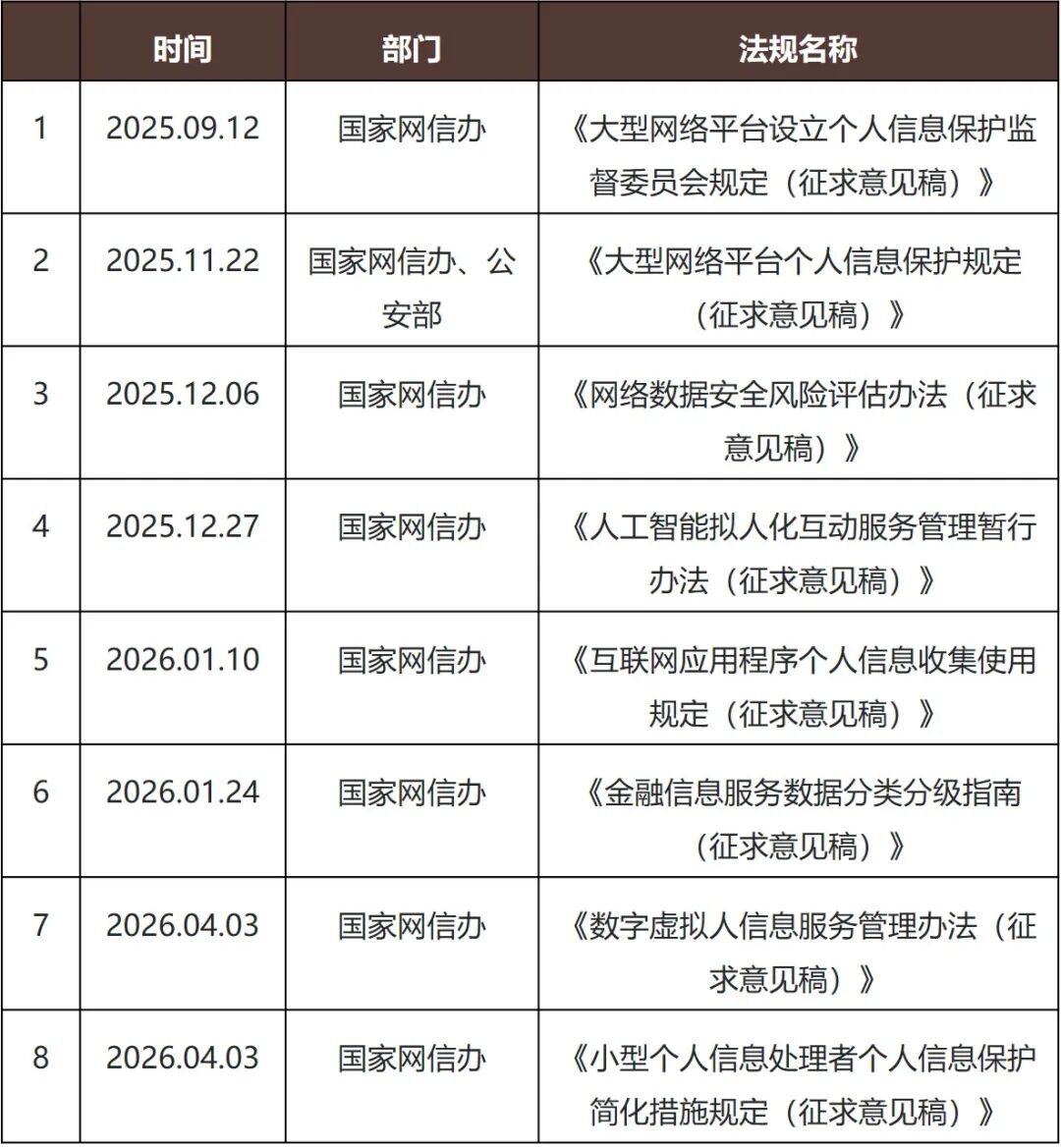 2026年专项行动以落实《个人信息保护法》、督促指导个人信息处理者不断提升合规水平为目标,依托于法律规定和相关配套标准,深化个人信息保护合规要求。自《个人信息保护法》出台以来的过去五年间,国家层面围绕《个人信息保护法》制定出台了一系列配套法规和标准,覆盖了个人信息出境、个人信息保护合规审计、人脸识别等领域,持续构建完善整体个人信息保护合规体系,这些是响应专项行动开展合规的法律依据。同时,我们也需要注意到个人信息保护合规仍然具有动态性,相关法规还在制定过程中,特别是今年有望出台的立法项目(详见下表),也应在合规视野范围以内。