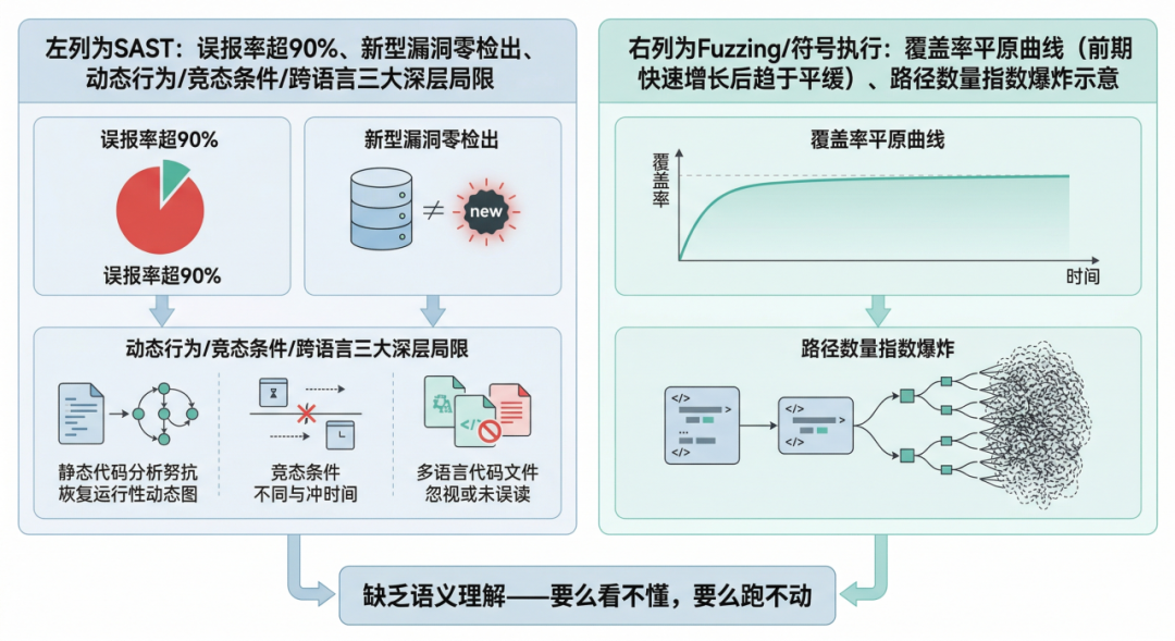 总的来说,传统工具在面对现代大型软件时,要么看不懂(SAST),要么跑不动(Fuzzing)。
