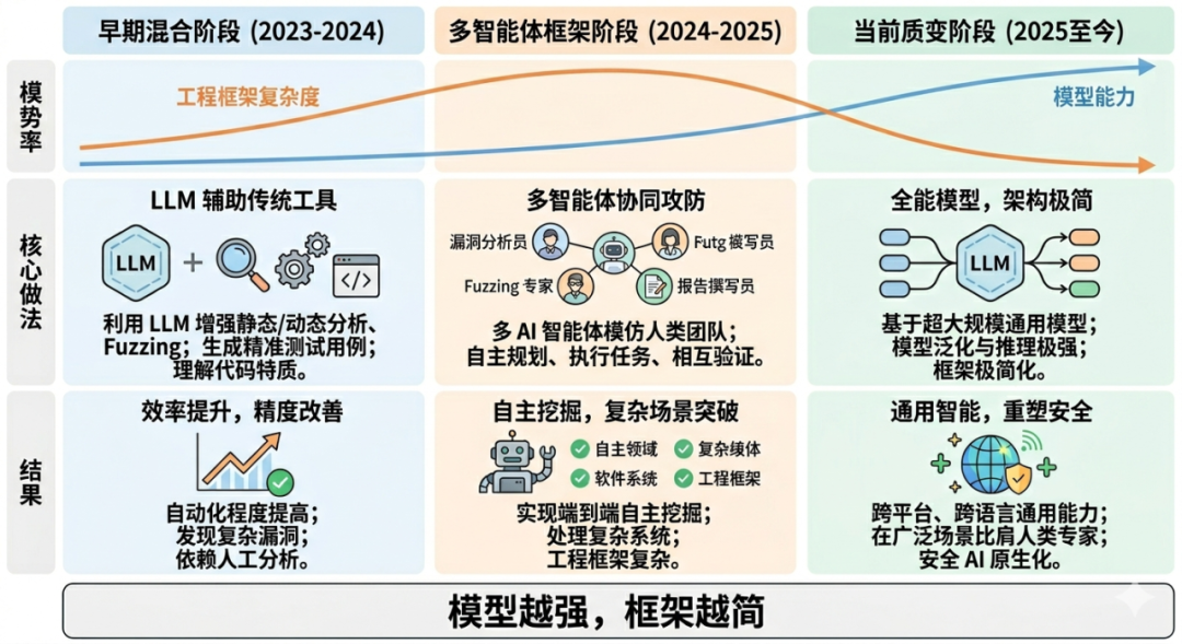 大模型在白盒漏洞挖掘中的角色经历了几个明显的阶段,每个阶段的突破点不同,但内在逻辑是连贯的,即随着模型自身能力的提升,外围工程框架的复杂度在不断降低。