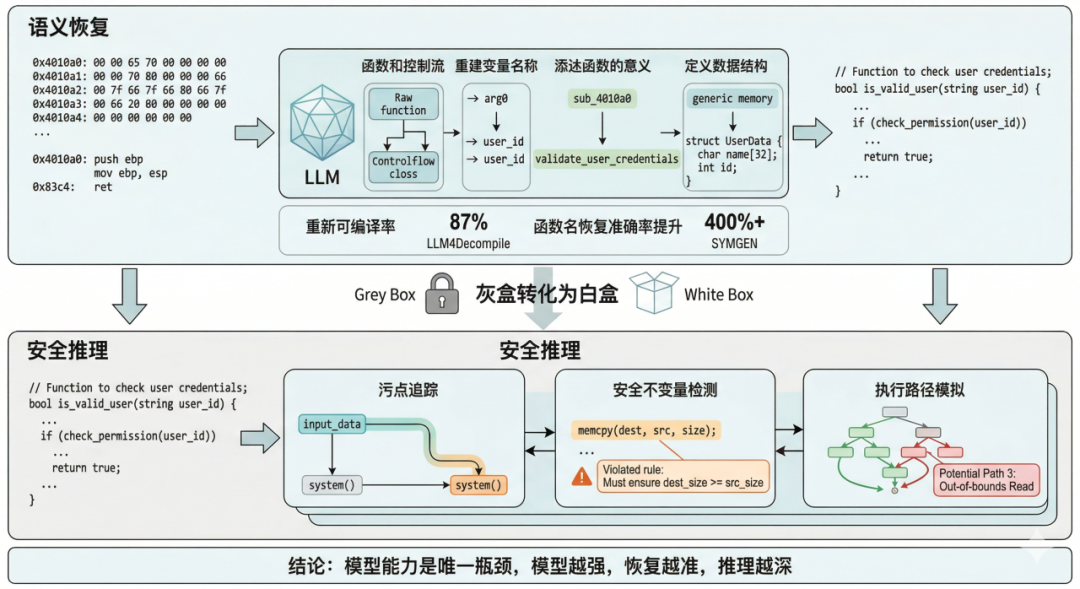 要理解大模型在灰盒场景中的核心贡献,需要先看清一个关键事实:灰盒分析的本质流程是"先恢复语义,再做安全推理"--而这两步都依赖模型自身的能力。