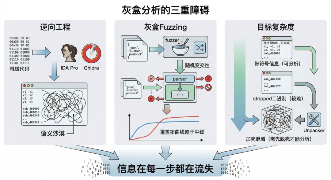 灰盒和白盒表面上只差了一步,从源代码到二进制,但这一步带来的信息损失是灾难性的。编译过程会系统性地剥离掉几乎所有的高级语义信息:变量名变成了寄存器编号,函数名变成了内存地址,数据结构的逻辑含义消失在了一堆指针偏移运算中,连代码注释和类型信息也被彻底丢弃。对于安全研究员来说,这意味着面对的是一片"语义沙漠"--代码在机械层面上是完整的,但它在说什么、为什么这么做,全靠人去猜。