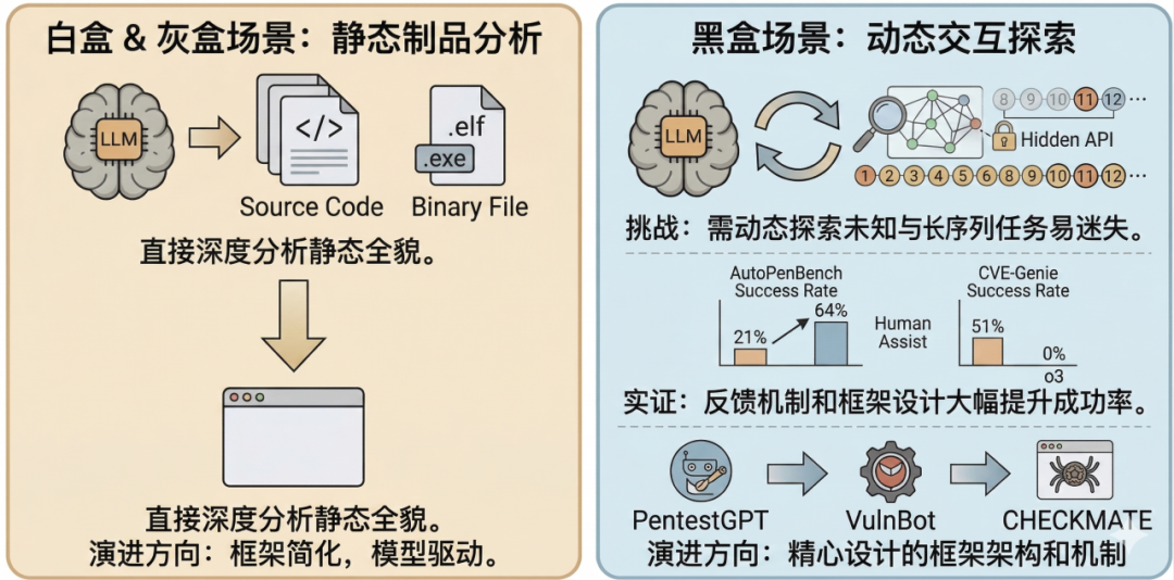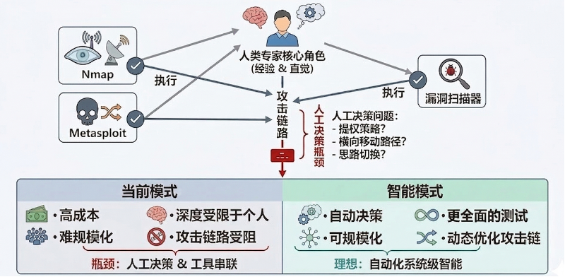 总的来说,传统黑盒方法的核心瓶颈是:把分散的工具能力串联成有效攻击链路的智能,完全依赖人类专家。