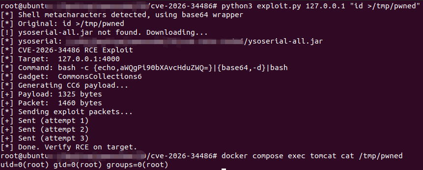 目前,奇安信威胁情报中心安全研究员已成功复现Apache Tomcat 远程代码执行漏洞(CVE-2026-34486),截图如下:
