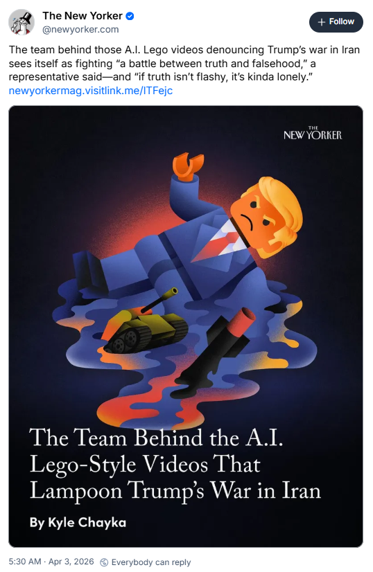 一些由伊朗团队制作的病毒式视频,将唐纳德·特朗普、杰弗里·爱泼斯坦、撒旦、本雅明·内塔尼亚胡、皮特·赫格塞斯、阿亚图拉·哈梅内伊等人物“乐高化”,以夸张、荒诞的形式进行再创作。