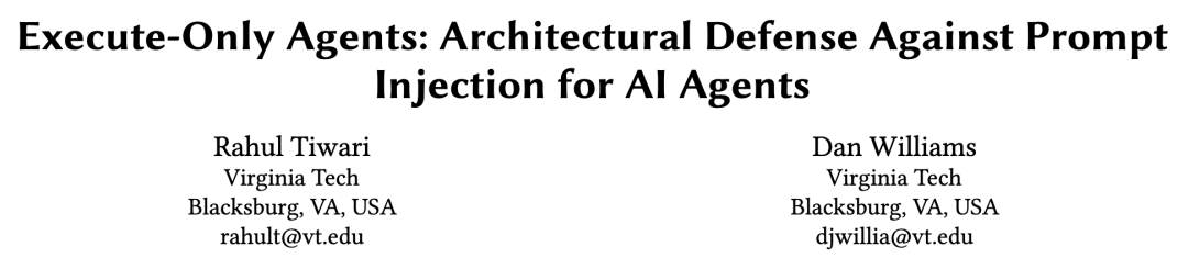 论文把这种架构叫做 Execute-Only Agents(XOA),作者来自 Virginia Tech,这篇文章发表于 Agentic OS ’26 workshop,是一篇很短的 3 页论文,更像一个架构提案,而不是已经被大规模实验完全验证的成熟系统。