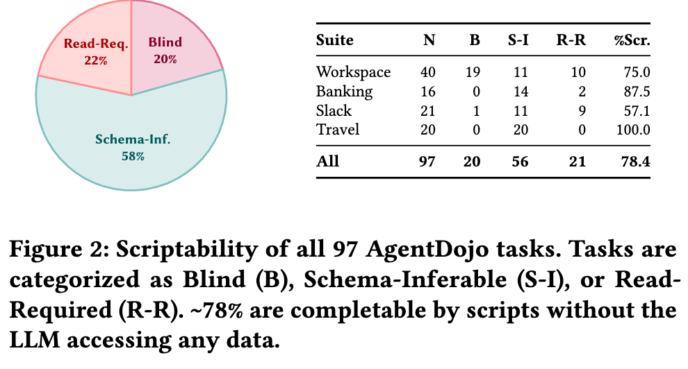 大约 78.4% 的任务都被他们归为前两类,也就是理论上可以在不让 LLM 接触任何不可信数据的情况下完成;其中 Blind 占 20%,Schema-Inferable 占 58%,Read-Required 只有 22%。分套件看,Workspace 为 75%,Banking 为 87.5%,Slack 为 57.1%,Travel 甚至达到 100%。