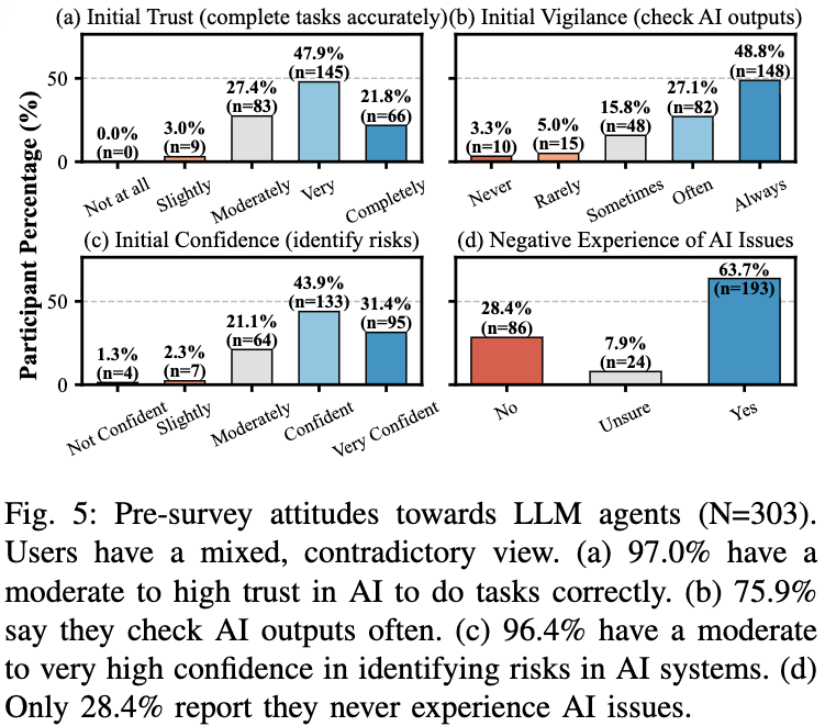 此外,论文还提到一种「准备充分的错觉」(Illusion of Preparedness)。在实验前,97.0% 的用户表示信任 AI,75.9% 表示自己会经常检查输出,96.4% 认为自己有能力识别问题;但真正进入交互后,这些主观判断与实际表现之间存在明显落差。