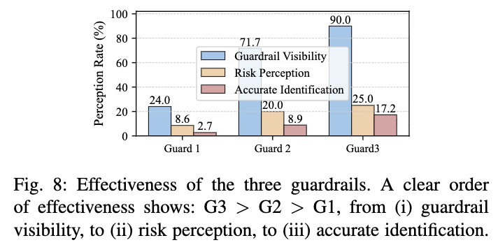静态免责声明(Guard 1):在实验开始前提供一次性提示。结果显示,只有约 24% 的用户注意到这类提醒,而对应的风险感知率仅为 8.6%。