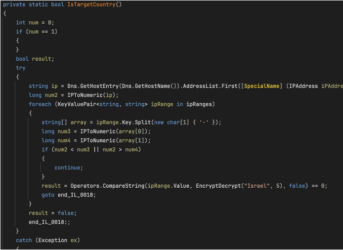 尽管 ZionSiphon 具备完整的攻击框架,但分析的这个样本存在一个致命的缺陷。在国家检查函数中,恶意软件会将 IP 地址范围对应的字符串与加密后的 "Israel" 字符串进行比较。