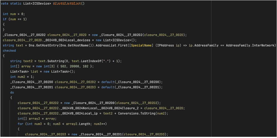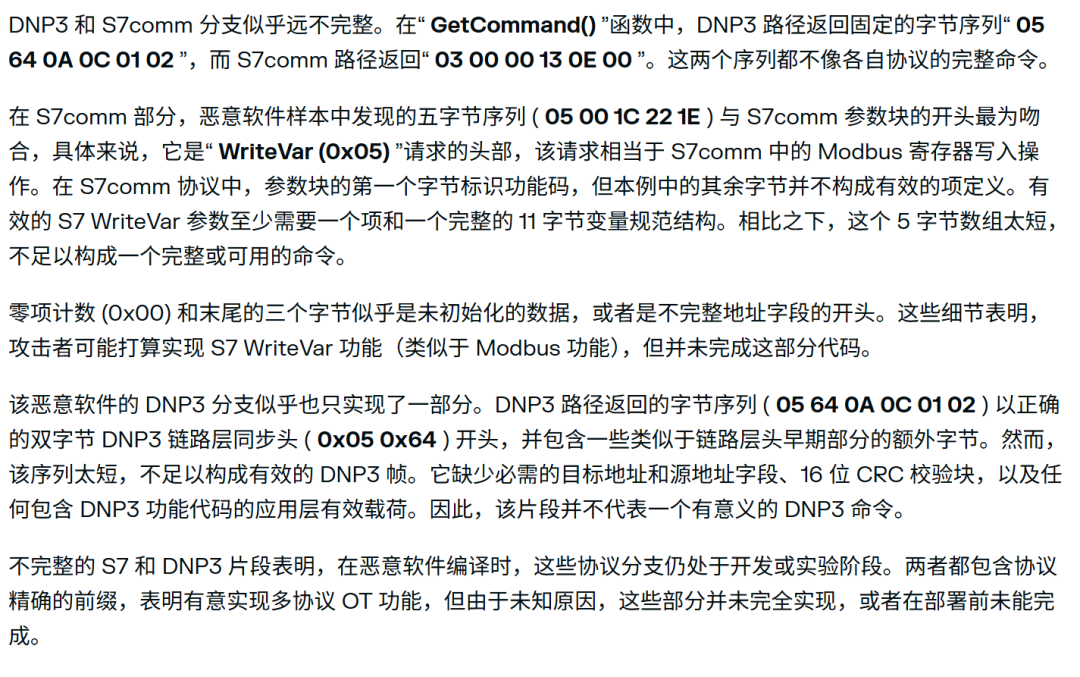 相比之下,DNP3 和 S7comm 协议的攻击逻辑还很不完善。恶意软件中只包含了这两个协议的头部信息,没有完整的命令结构,无法执行有效的攻击操作。这表明攻击者可能还在开发这些功能。
