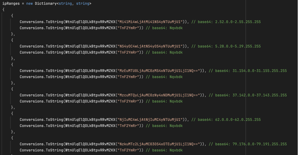 ZionSiphon 最显著的特征是其硬编码的以色列 IP 地址范围。恶意软件在执行任何操作之前,会首先检查本地主机的 IP 地址是否属于以下几个以色列网段: