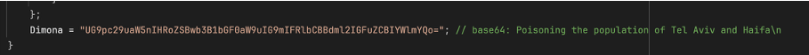 恶意软件的二进制文件中包含了两段经过 Base64 编码的字符串,这些字符串不具备任何实际功能,但清晰地揭示了攻击者的政治立场。第一段解码后内容为:"支持我们在伊朗、巴勒斯坦和也门的兄弟,反对XXX侵略。我是 0xICS。"