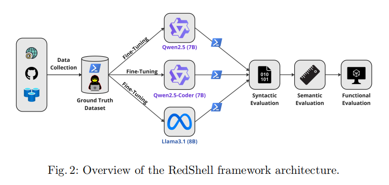 其次,研究者提出并实现了 RedShell 这一模块化框架,通过 Unsloth 与 LoRA 的组合实现了轻量化微调,单张消费级 GPU(NVIDIA RTX 4090)即可完成全部训练流程,显著降低了硬件门槛。