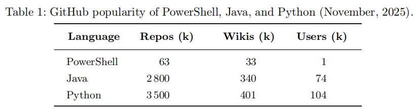 然而,现有的通用 LLM 在这一场景下面临明显局限。一方面,ChatGPT 等专有模型内置了严格的伦理安全边界,会对生成攻击性内容的请求加以拒绝或阉割,测试人员不得不花费额外的时间和精力进行提示词工程来绕过这些限制。另一方面,将渗透测试目标的主机名、IP 地址等敏感信息发送到第三方云端模型,存在明显的数据泄露风险,在商业渗透测试场景中尤为不可接受。此外,公开可用的攻击性 PowerShell 数据集极为稀缺——与 Java(280 万个仓库)、Python(350 万个仓库)相比,GitHub 上的 PowerShell 仓库数量仅约 6.3 万个,这使得在该领域训练 LLM 面临显著的数据稀缺挑战。