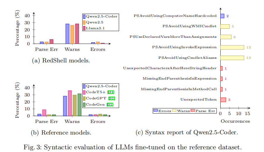 语法评估借助微软提供的静态 PowerShell 代码检查工具 PSScriptAnalyzer 完成,主要检测三类问题:解析错误(Parse Error,高严重性,阻止代码执行)、警告(Warnings,不良编程实践或意外语法模式)以及错误(Errors,违反 PowerShell 语义或安全规则)。评估结果显示,RedShell 的三款微调模型均实现了超过 90% 的语法合格率(无解析错误),其中 Qwen2.5 和 Qwen2.5-Coder 的表现尤为突出,合格率接近 95%。值得关注的是,所有模型触发了超过 25% 的安全警告,这恰恰印证了模型确实具备生成高风险代码的能力。与参考基线模型(CodeGPT、CodeGen、CodeT5+)相比,Qwen2.5-Coder 在解析错误率这一关键指标上与之持平,但后者还额外接受了来自 GitHub 的 89,814 条通用 PowerShell 代码的预训练,而 RedShell 仅依靠轻量化微调即达到了同等水平,充分体现了其训练效率优势。